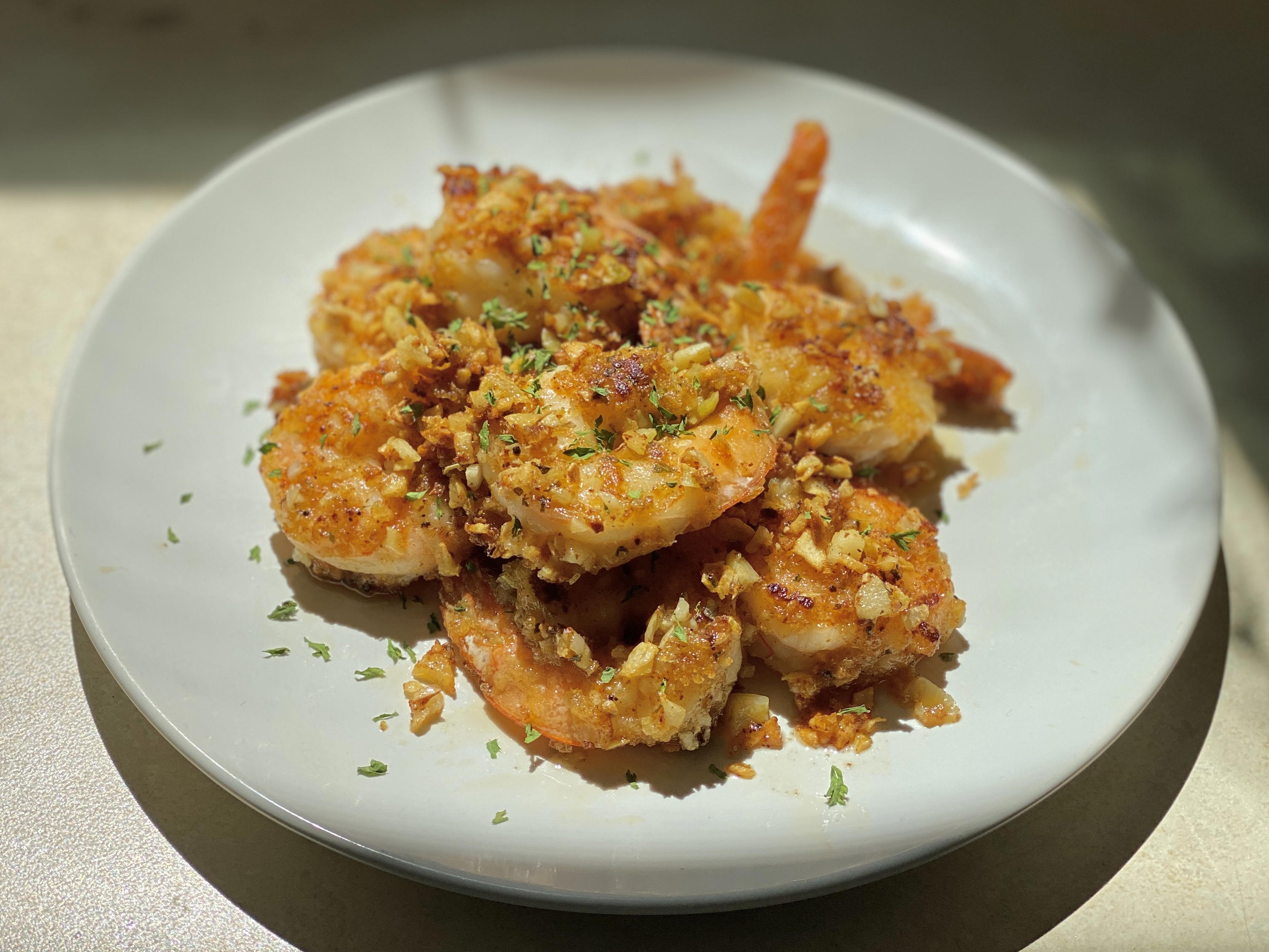 Marinate shrimp in paprika (1 Tbsp), garlic powder (2 tsp), salt and pepper (to taste), cornstarch (2 Tbsp), and panko (1 Tbsp).
